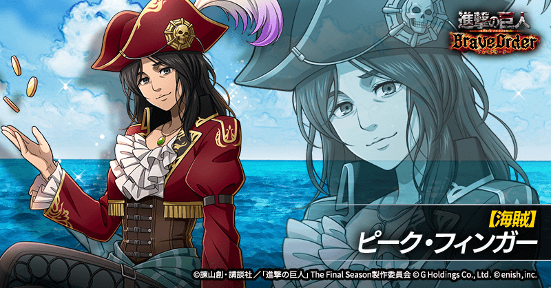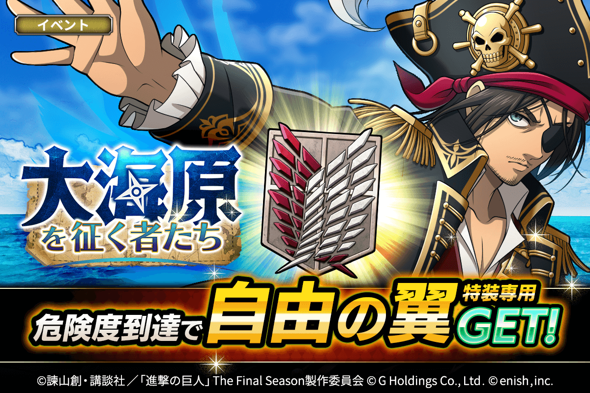 enish<3667>は、「進撃の巨人Brave Order」にて、7月14日(金)より、新イベント「大海原を征く者たち」を開催する。ミッションを達成して特装専用の自由の翼を手に入れよう。また、本日より新登場の【海賊】エレン・イェーガー、【海賊】ピーク・フィンガー、【海賊】ファルコ・グライスがピックアップされた「大海原を征く者たちガチャ」も開催。