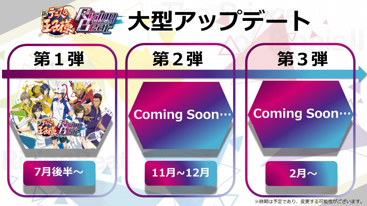 新テニスの王子様 RisingBeat(略称:テニラビ)において、今年の夏より大型アップデートを実施いたします!今回の大型アップデートでは、さまざまな新機能や既存の機能改修を行い、テニラビは新たなフェーズへと進化し、より一層楽しさと多様なプレイ体験をお届けいたします。