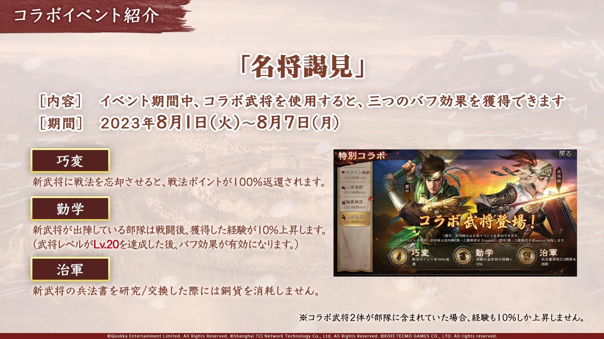 1.「名将謁見」:期間中にコラボ武将を使用すると、3つのバフ効果を獲得できます。