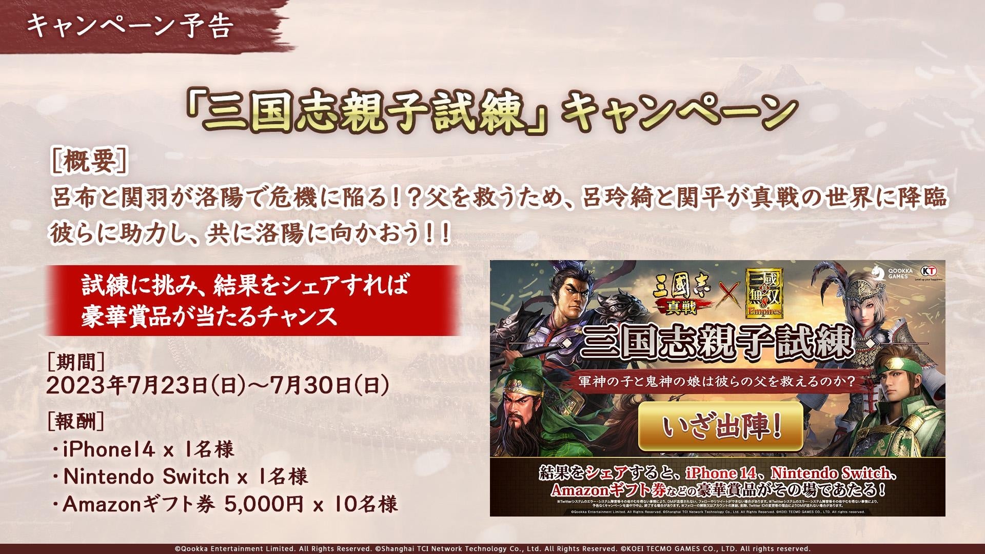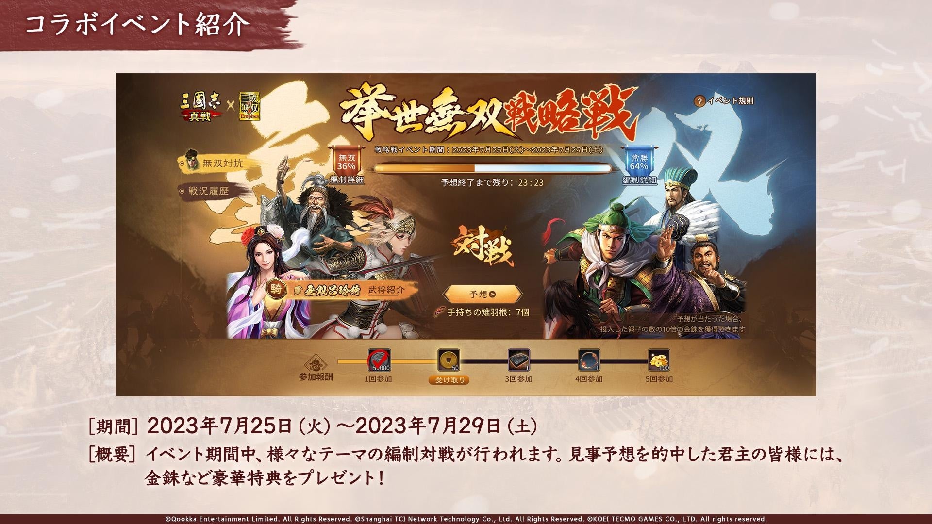 Qookka Entertainmentは、コーエーテクモゲームスの歴史シミュレーションゲーム「三國志13」のIPを使用し、同社監修のもと開発されたスマートフォン向けゲームアプリ『三國志 真戦』において、コーエーテクモゲームスの人気タイトル『真・三國無双8 Empires』とのコラボイベントを2023年8月1日(火)から実施することを決定した。7月14日(金)配信の『三國志 真戦』公式生放送特番(番組はこちら⇒ https://www.youtube.com/watch?v=NH9KQyp6CJc )にて本情報を解禁した。