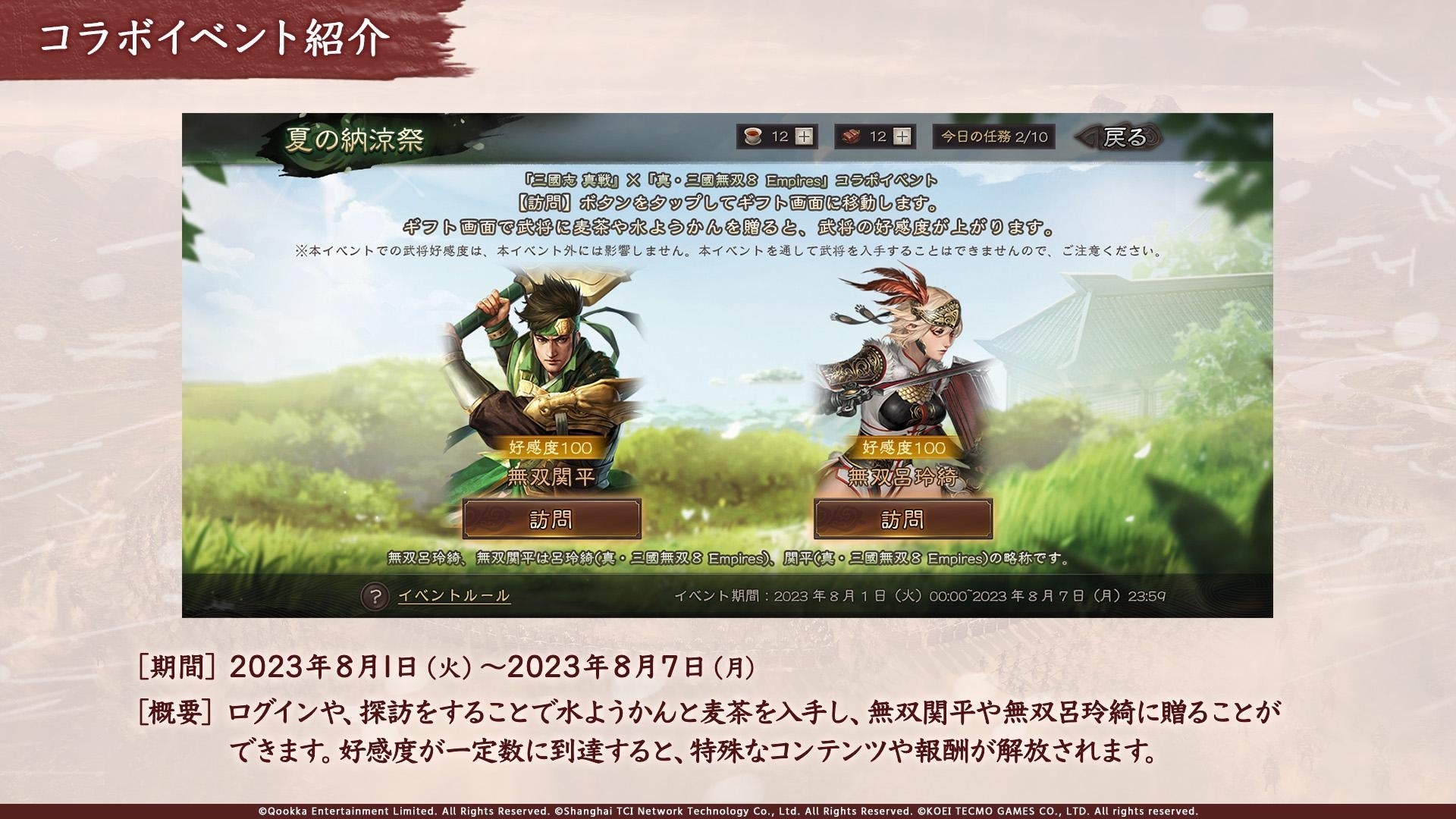 ・開催概要:今回のコラボ武将「無双呂玲綺」と「無双関平」に対する好感度を上げていきます。ログインや探訪をすることで水ようかんと麦茶を入手し、各武将に贈ることができます。好感度が一定数に到達する、特殊なコンテンツや報酬が解放されます。