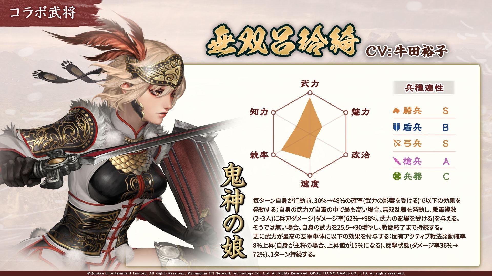 今回のコラボでは、『真・三國無双8 Empires』から呂玲綺と関平が登場します。「真・三國無双」シリーズで高い人気の呂玲綺は、父である鬼神呂布と同様に戦場で活躍する女性武将です。そして、『真・三國無双4』で初登場した関平は、父である軍神関羽と共に多くの戦場に立ち、最期まで親子で活躍したことで知られています。『三國志 真戦』でも、それぞれが持つ強力な戦法などによって大活躍することができるでしょう。