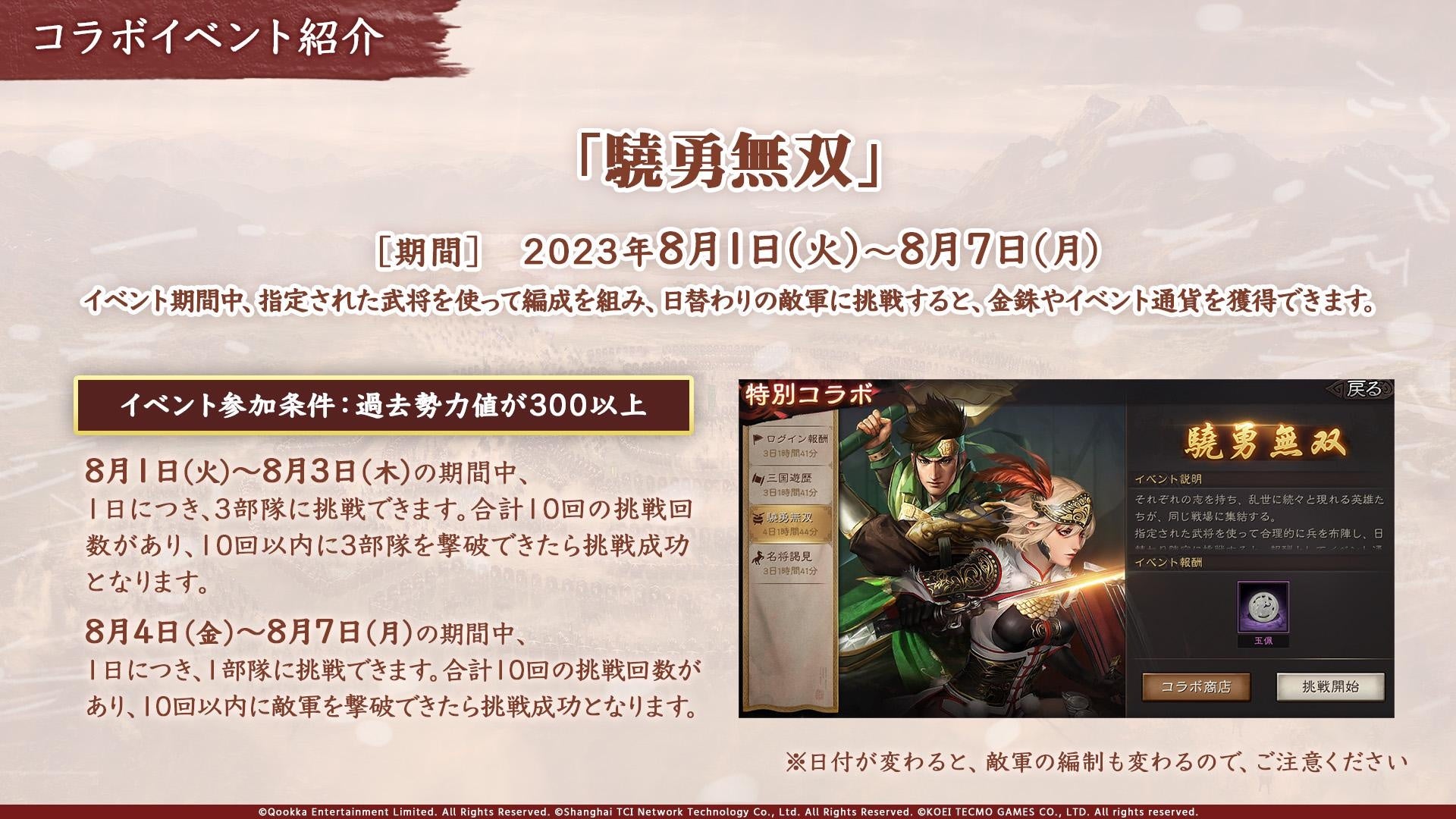 2.「驍勇無双」:ユーザーは公式が用意した武将リストから3人の武将を選びチームを編制し、敵対陣営に挑みます。勝利した場合、イベントアイテムが獲得できます。また、毎日異なる敵対陣営を更新!コラボ期間中、選択可能な武将リストでコラボ武将を選択しゲームプレイ可能。コラボ武将を連れて参加しよう!