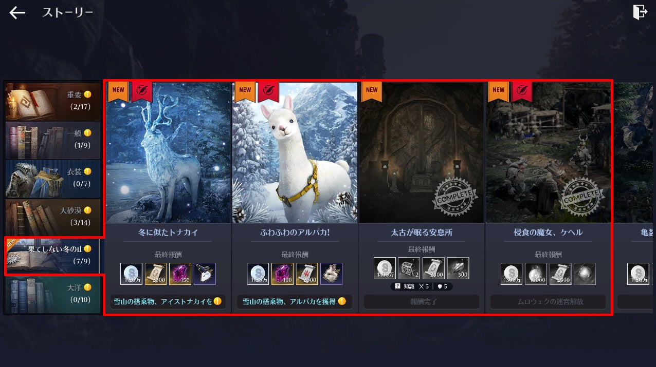 追加されたストーリーは「侵食の魔女、ケヘル」「太古が眠る安息所」「ふわふわのアルパカ!」「冬に似たトナカイ」 です。当該ストーリーを完了すると、果てしない冬の山の知識および称号を獲得でき、ストーリー「ふわふわのアルパカ!」「冬に似たトナカイ」を完了すると、雪山専用の搭乗物である「アルパカ」「アイストナカイ」を獲得できます。※これらのストーリーは、ストーリー「太古が眠る安息所」を完了すると進行できます。