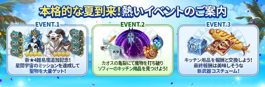 本アップデートより、カオスゲートで獲得した料理道具の交換や、ミッションクリア報酬などで様々なアイテムを獲得できるイベントを開催いたします。