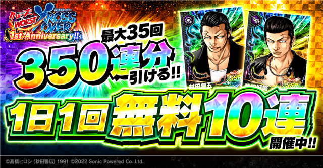 ソニックパワードは、『クローズ×WORST - XROSS OVER -』が7⽉20⽇にサービス開始から1周年を迎えたことを記念し、「最⼤350連1⽇1回無料10連ガチャ」などのお得な企画が開催される”1st アニバーサリー”を実施中。他にも、鈴蘭男⼦⾼校の伝説 リンダマンこと「林⽥恵」がプレイアブルキャラクターとして初登場!現在開催中の、期間限定のキャラ強化イベント「男気鍛練」でさらにパワーアップを狙うことができる。