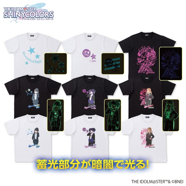 白ボディと黒ボディの2色展開。蓄光プリントを施しており、暗所でアイドルのイラストが光る。Tシャツとして着ても、お部屋のインテリアとしてポスター感覚でも楽しめる。