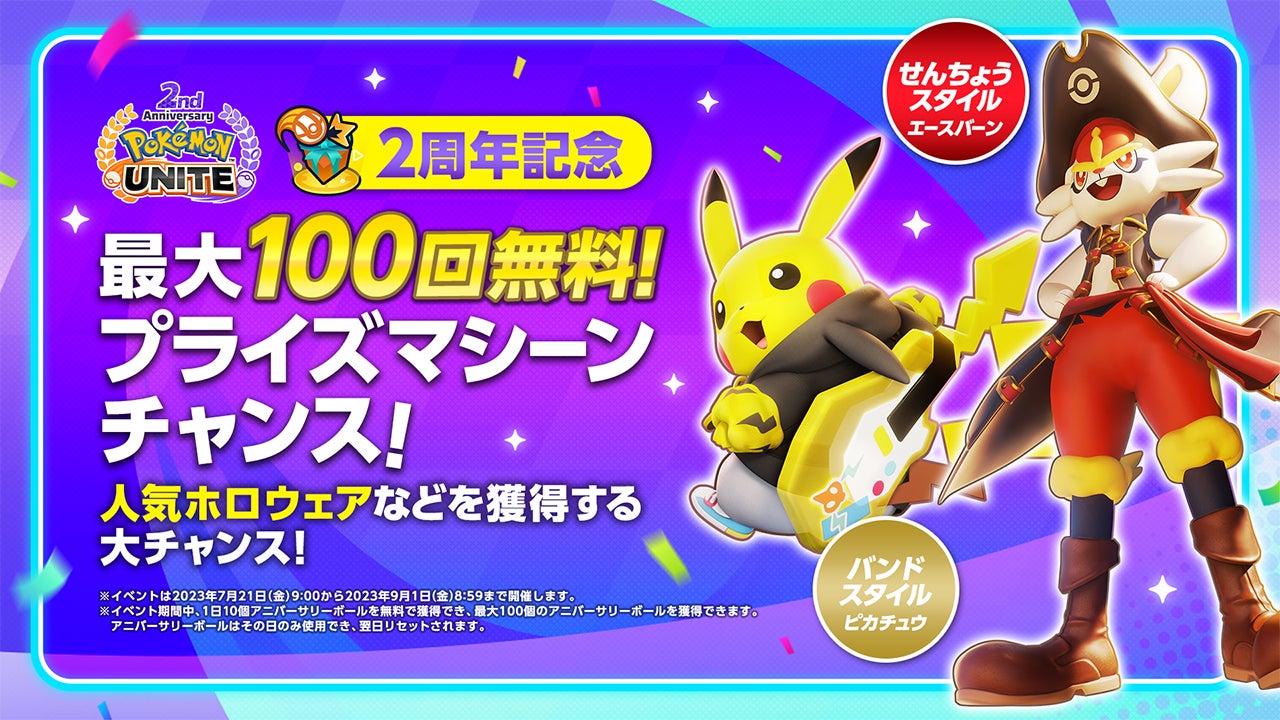 2周年を記念して、「最大100回無料!プライズマシーンチャンス!」を開催!「せんちょうスタイル‐エースバーン 」や「バンドスタイル‐ピカチュウ 」など、人気のホロウェアや豪華報酬を獲得する大チャンス!