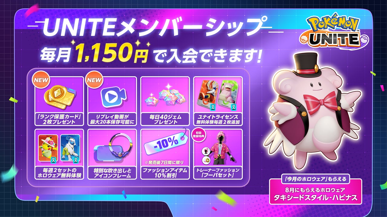 初回登録特典として、さらにトレーナーファッション「フーパセット」をプレゼント! たくさんプレイする方には、お得な内容になっております。毎月1,150円(税込)で入会できます。 「UNITEメンバーシップ」に関するFAQは、こちらからご確認いただけます。