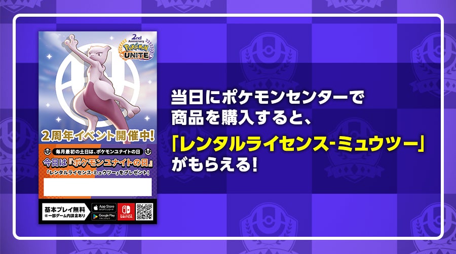 8月5日(土)・6日(日)の「ポケモンユナイトの日」に全国のポケモンセンターでお買い物をすると、『ポケモンユナイト』でミュウツーのバトルが体験できるギフトコードをプレゼント。もらえるギフトコードは、ミュウツーのレンタルライセンス。