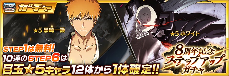 8周年キャラクターの黒崎一護(8周年記念ver.)とホワイト(8周年記念ver.)が登場するステップアップガチャを開催!