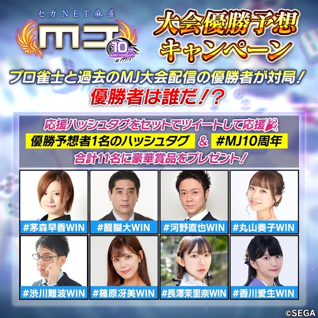 MJアプリ10周年を記念して、本日配信予定の「MJ10周年記念大会」の優勝予想キャンペーンを開催中。『MJモバイル』公式Twitterアカウント(@sega_MJ)をフォローの上、優勝予想者1名の応援ハッシュタグと「#MJ10周年」のハッシュタグをつけてツイートしてくれた参加者の中から、抽選で合計11名に「MJチップ100万枚」「オリジナルQUOカード1,000円分」をプレゼントする。