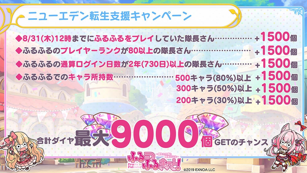 1. 8月31日(木)12:00までにふるーつふるきゅーと!をプレイしていた方:ダイヤ1500個