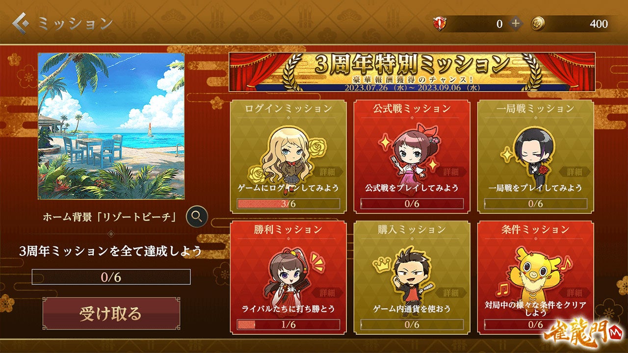 追加されたチャレンジミッションからは3周年雀龍門チケットや各3周年ガチャチケットを獲得できます!