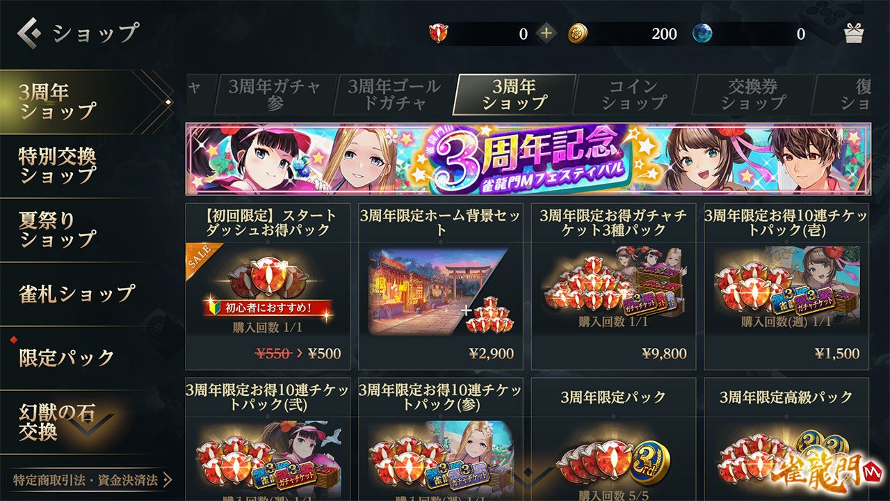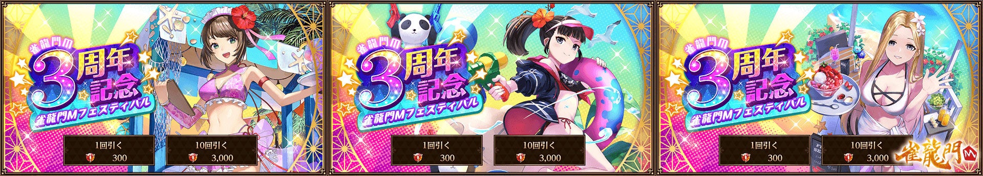 龍宝をお得に購入できる特別なパック商品や、「雀龍門M3周年記念雀龍門フェスティバル!!」イベント限定アイテムが出現するガチャなどをご用意しました。