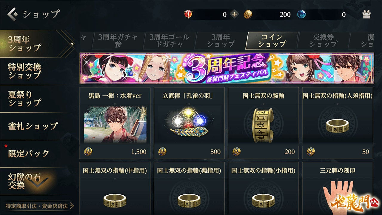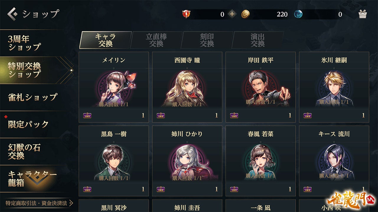 3周年雀龍門チケットを集めると、イベントショップよりイベント限定キャラクター等と交換できます。