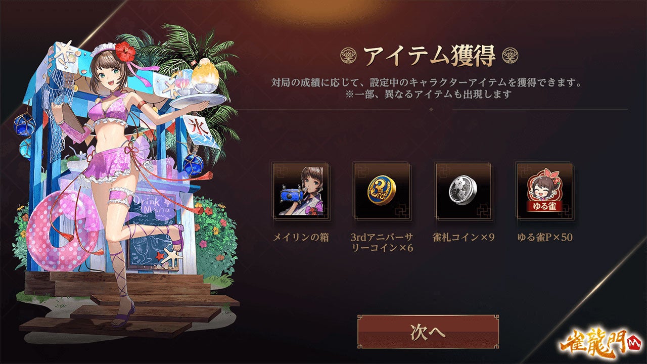 水着の装いをした雀龍門フェスティバル限定キャラクター「メイリン:水着ver」、「メイシン:水着ver」、「メイファ:水着ver」、「黒島 一樹:水着ver」が登場します。