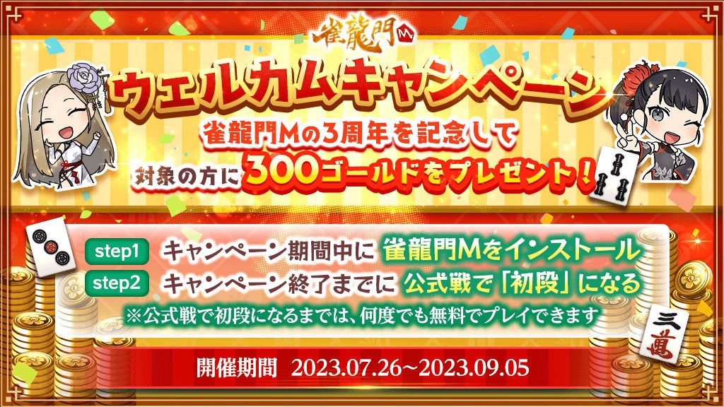 「雀龍門M3周年記念雀龍門フェスティバル!!」の開催を記念して、ゴールドがたっぷりもらえる「ウェルカムキャンペーン」を開催します。