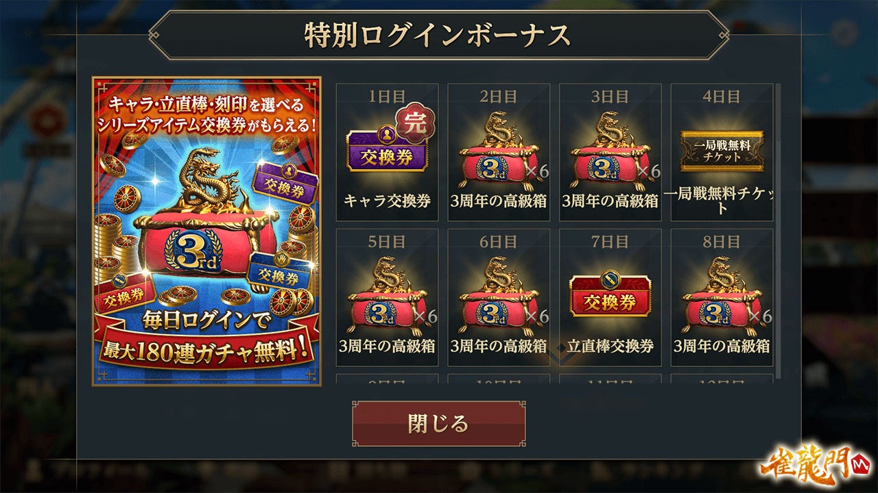 イベント期間中、雀龍門Mにログインするとログインボーナスとして3周年の高級箱やルーレットメダルが獲得できます。