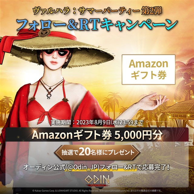 7月20日メンテナンス後より開催最中の夏のキャンペーン「ヴァルハラ:サマーパーティ―第1弾」に続き、7月27日からは、抽選で豪華賞品が当たる「ヴァルハラ:サマーパーティ―第2弾」を開催する。キャンペーンに参加すると、抽選で20名にAmazonギフト券5,000円分をプレゼント!キャンペーンに参加し、是非ゲットしよう!