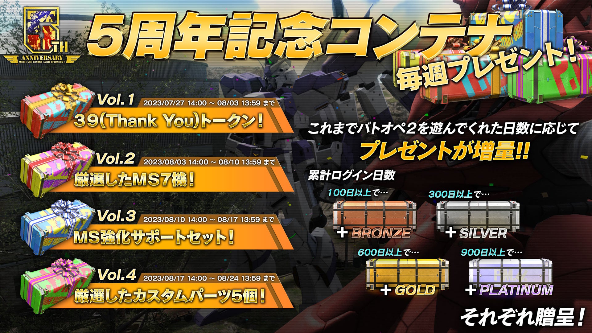 感謝の39(Thank You)トークンやMS、強化アイテムセット、カスタムパーツなど、4週にわたり毎週記念コンテナがプレゼントされます。また、『バトオペ2』累計ログイン日数に応じてプレゼントがさらに増量いたします!