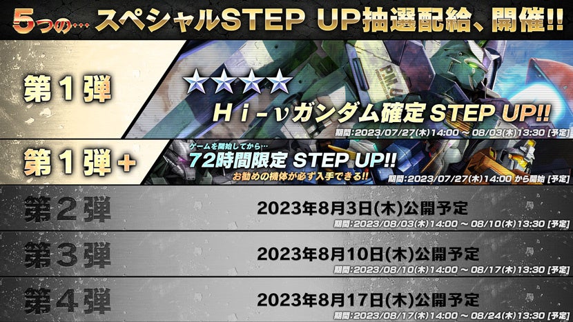 「Hi-νガンダム」を確定入手できるSTEP UP、未入手の機体が獲得できるSTEP UPなど、