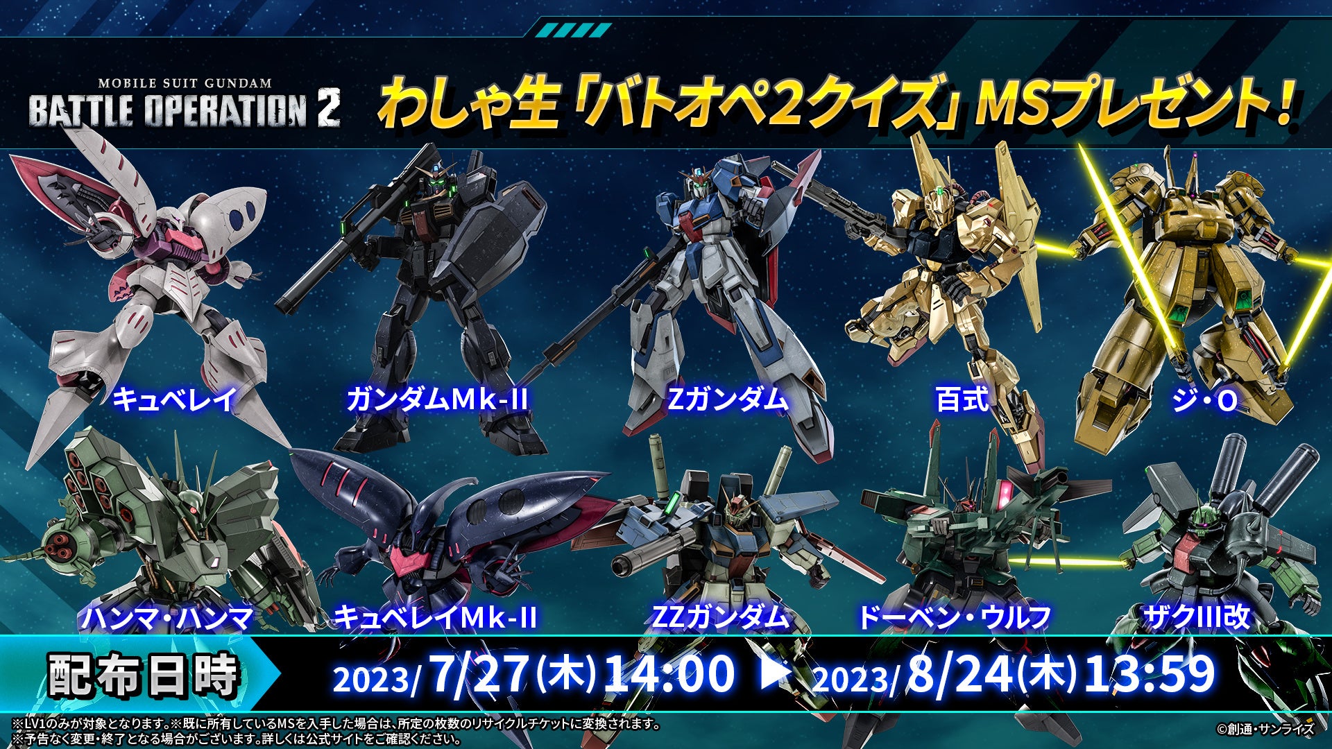 「【バトオペ2 祝5周年】マフィア梶田と中村悠一の「わしゃ生」#37【わしゃがなTV】」にて行われた「バトオペ2クイズ」において、お二人が全問正解したため、全てのパイロットの皆さまにMS10機体をプレゼントいたします!