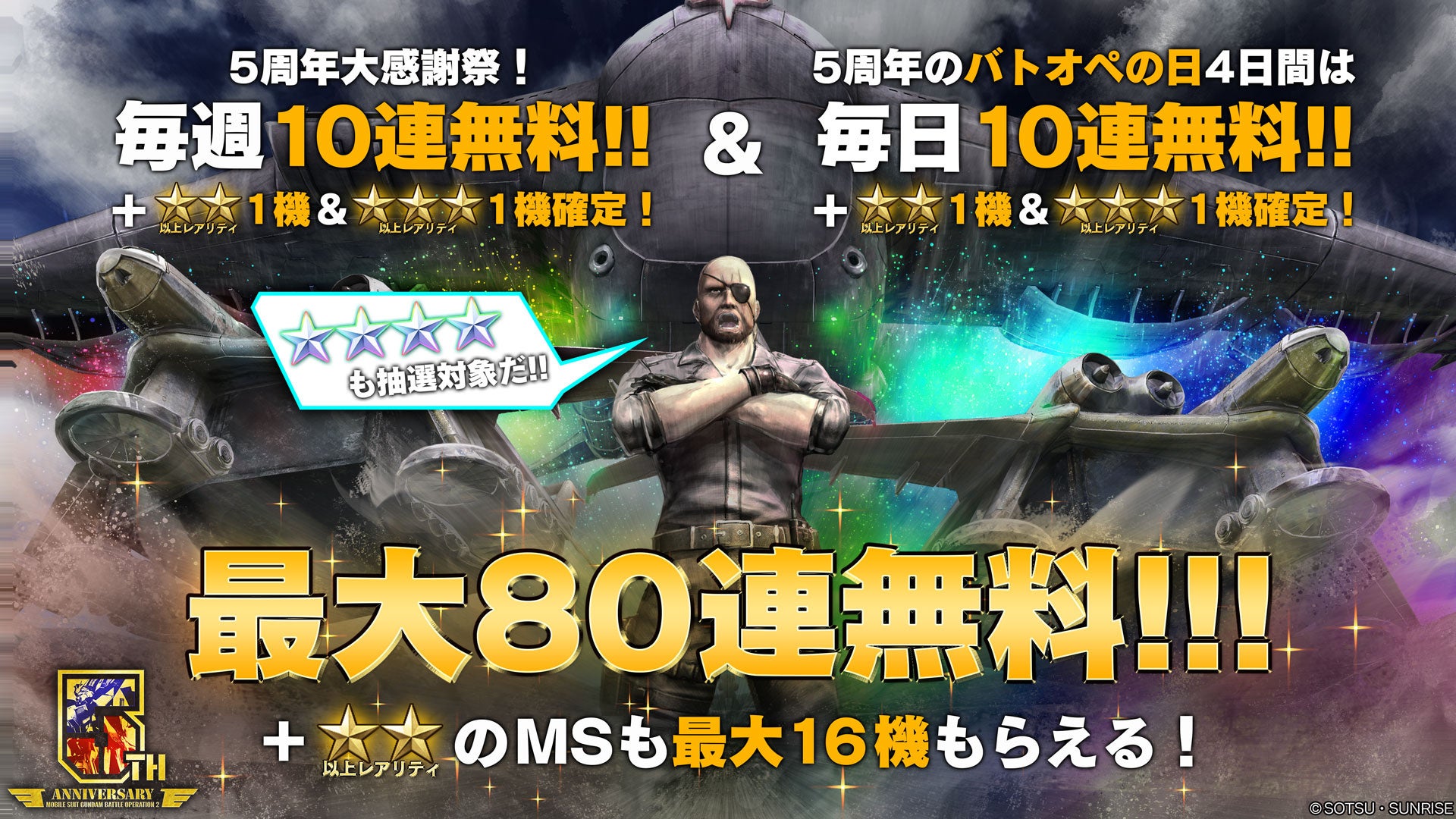 「5周年大感謝祭」の期間中、10連無料抽選配給(★★以上レアリティのMS1機確定&★★★以上レアリティのMS1機確定)を毎週実施いたします。さらに「5周年大感謝祭」中は、毎月第1木曜日から日曜日まで行なわれる「バトオペの日」の4日間、1日1回無料の抽選配給を1日1回10連無料の抽選配給(★★以上レアリティのMS1機確定&★★★以上レアリティのMS1機確定)に変更いたします。最大80連が無料、さらに★★以上レアリティのMSが最大16機獲得できるこのチャンスをお見逃しなく!