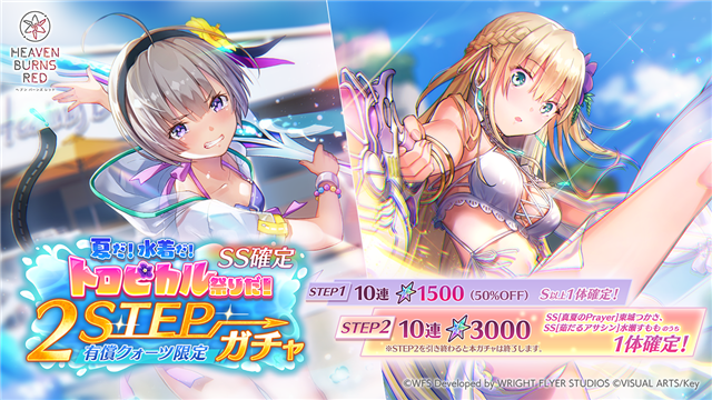 ストーリーイベント「夏だ!水着だ!トロピカル祭りだ!」のピックアップを記念して、有償クォーツ限定のガチャを開催する。本ガチャでは、SS[真夏のPrayer] 東城つかさ、SS[茹だるアサシン] 水瀬すもも がピックアップされ、提供割合がアップ!さらに、STEP2の10連目では、SS[真夏のPrayer] 東城つかさ、SS[茹だるアサシン] 水瀬すもものどちらかが確定で出現!