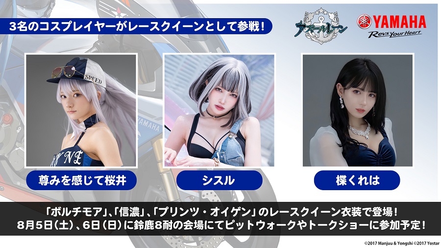 『アズールレーン』はヤマハ発動機株式会社とのコラボレーションプロジェクトとして、コラボチーム「IRF with アズールレーン」は昨年に続き、2023 年 8 月に開催される日本最高峰の 2 輪レース 2023“コカ・コーラ”鈴鹿 8 時間耐久ロードレースに参戦。No.41「IRF with アズールレーン」からは川名拳豊選手、澤村元章選手、遠藤晃慶選手の 3 名でレースに挑む。