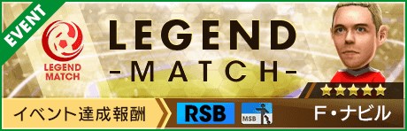 「レジェンドマッチ」は、レジェンドチームと対戦し、勝利ポイントゲージが一定量に達すると豪華なアイテムが獲得できるイベント。今回の「レジェンドマッチ」では、10,000pt達成報酬の★5選手が入れ替わり、新★5選手「F・ナビル」が登場する。なお、開催中のレジェンドマッチをプレイすることで達成できる1回限定ミッションでは「能力UP極秘練習」や「監督スカウトチケット」のほか、新★5選手「F・ナビル」も獲得できるので、挑戦
