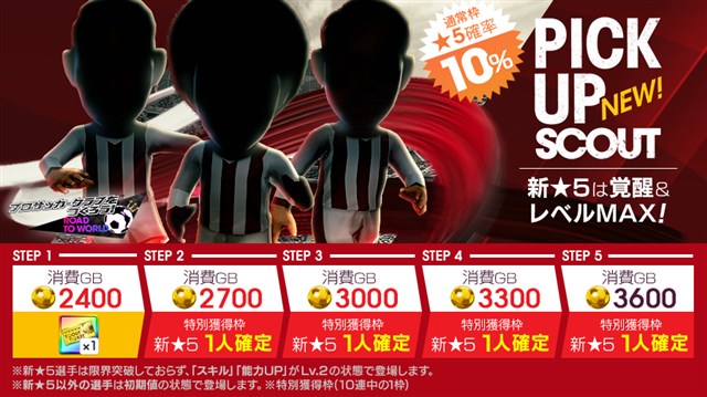 通常枠の★5出現確率が10%となっており、STEP1で「★5確定スカウトチケット」1枚の特典が付くほか、STEP2~5で新★5選手1人確定の特別獲得枠もついている。さらに、STEP1がGB2400個で、STEP2~STEP4もお得なGBでプレイできる。