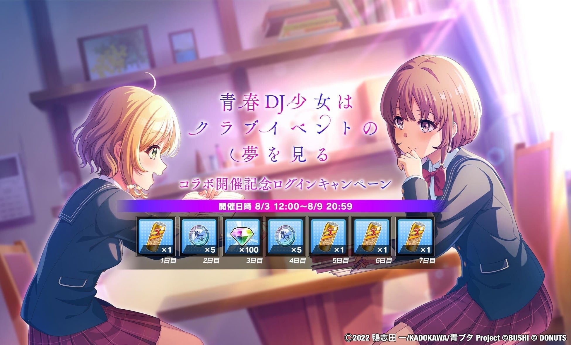 ブシロード<7803>とDONUTSは、『D4DJ Groovy Mix』(以下『グルミク』)において、「青春ブタ野郎はおでかけシスターの夢を見ない」とのコラボイベント&ガチャ「青春DJ少女はクラブイベントの夢を見る」を8月3日(木)12:00より開始した。