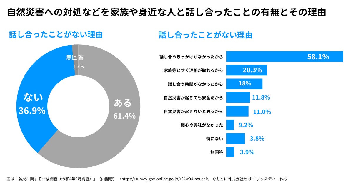 しかしながら、内閣府が令和4年9月に実施した世論調査のうち「防災に関する世論調査」によると、「自然災害への対処について家族や身近な人と話し合ったことがない」と回答した人は36.9%、その理由として「話し合う機会がないことや家族と連絡がすぐ取れると思うから」、「災害が起きたとしても安全だと思うから」、「自然災害が起きないと思うから」などが見受けられました。