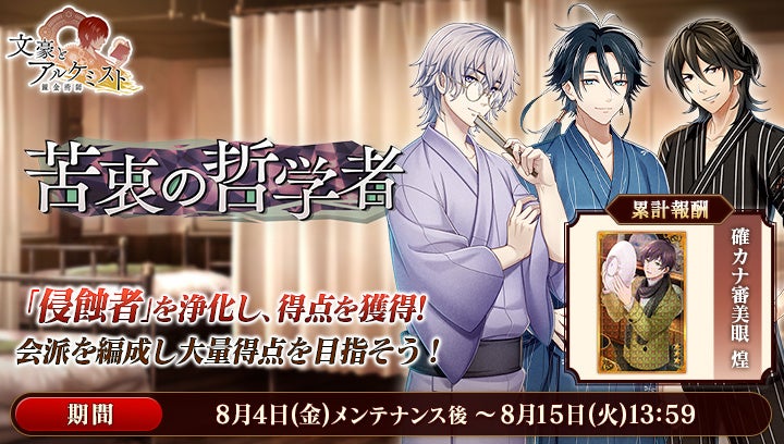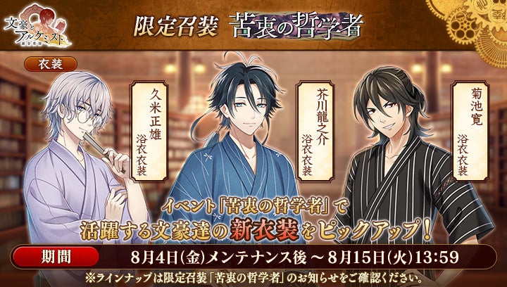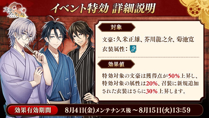 さらに、イベントと同時に開催される限定召装『苦衷の哲学者』にて新規追加された「久米正雄」「芥川龍之介」「菊池寛」の〈浴衣衣装〉を編成すると、得点の獲得率がそれぞれ30%上昇します。