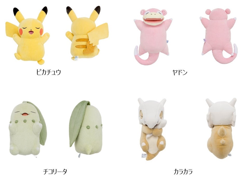 おやすみちゅうのピカチュウ、ヤドン、チコリータ、カラカラのもっちりぬいぐるみ。※種類は選べません。