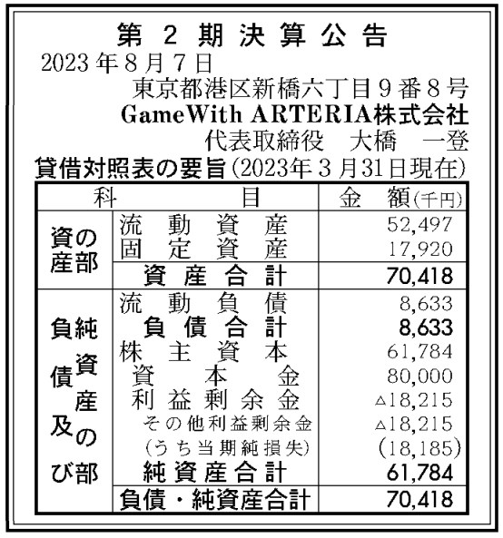 GameWith ARTERIAの2023年3月期(第2期)の決算は、最終損失1800万円だった。設立1期目となる前の期(2022年3月期)の実績は最終損失300万円だった。8月7日付の「官報」で判明した。