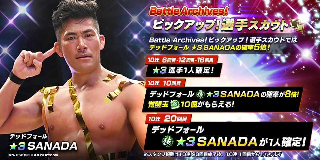 新日SSは2023年8月9日(水)メンテナンス終了後から、★3「[デッドフォール]SANADA」が登場する「Battle Archives!ピックアップ!選手スカウト」を開催。本スカウトにて、10連スカウトを既定回数行うと、ラインナップに含まれる★3選手からいずれか1人を確定で獲得できる仕様とる。
