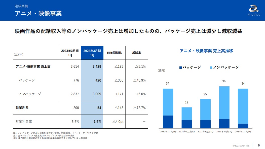 エイベックス<7860>は、8月10日、第1四半期のアニメ・映像事業の業績について、売上高が前年同期比5.1%減の34億2900万円、営業利益が同72.7%減の5400万円と大幅減益だったことを決算説明資料で明らかにした。