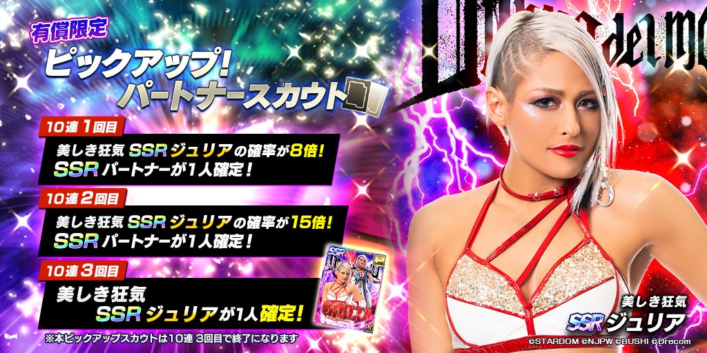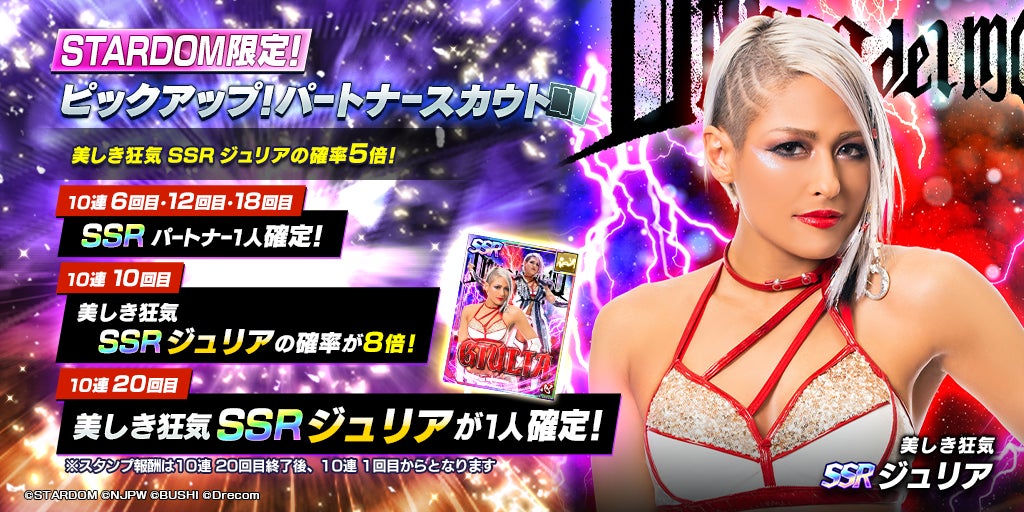 - STARDOM限定のSSRパートナーが新しく登場!SSR「[美しき狂気]ジュリア」をピックアップしたパートナースカウトを開催!