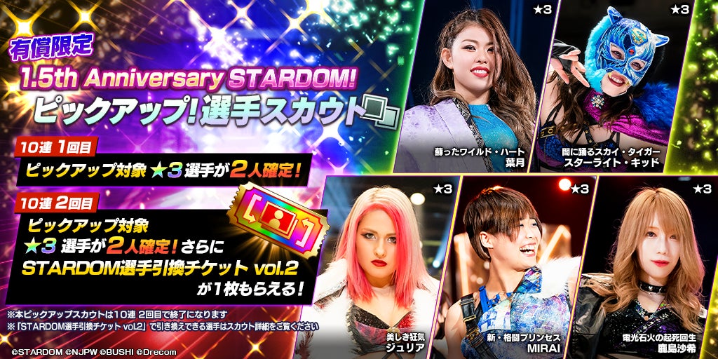 本スカウトは、10連1回目と2回目でピックアップ対象★3選手が2人確定し、10連2回目では「STARDOM選手引換チケットvol.2」を1枚獲得できる。なお、本スカウトは2回引くと終了となる。