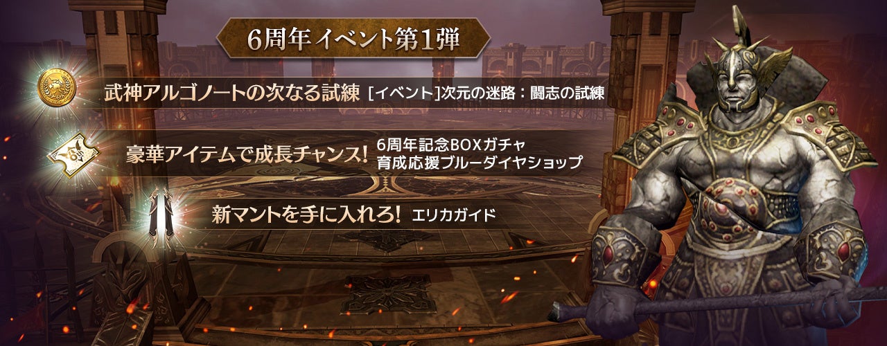 イベント期間中、「次元の迷路:闘志の試練」や連動するエリカガイドミッションのクリアで、新規マント「英雄のマント」や「6周年記念の図案」、「[6周年記念]BOXガチャチケット」などの豪華成長アイテムを入手することができます。