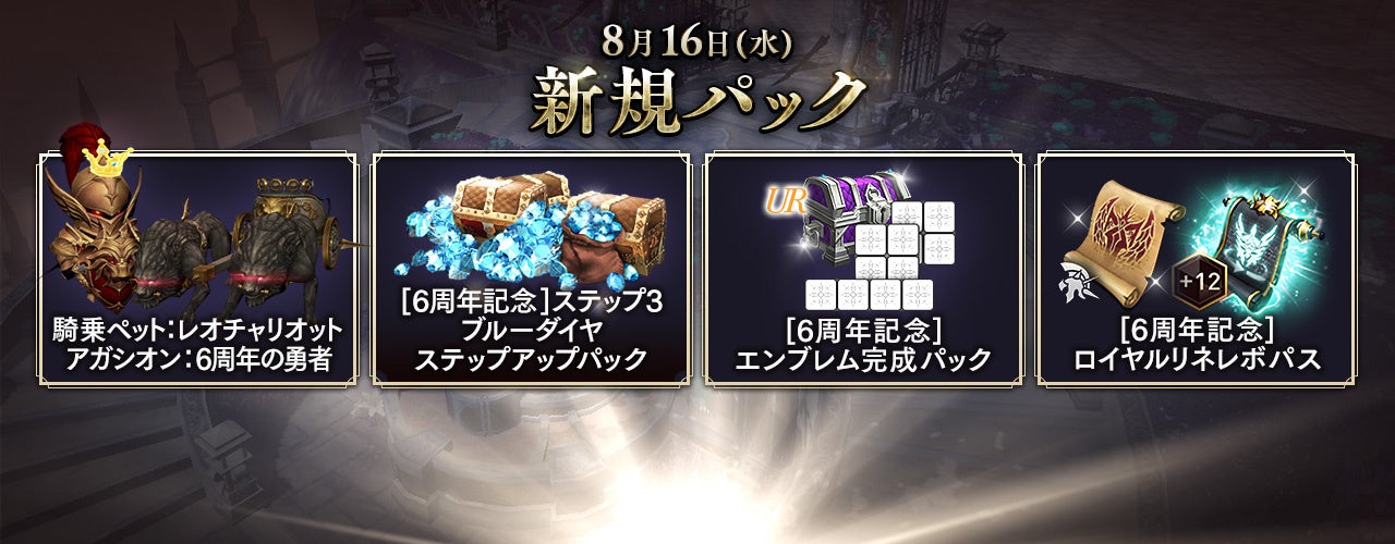 本アップデートにて、6周年を記念した新アイテムや新商品を多数追加しました。「6周年記念エンブレム」、新ペンダント「栄光の試練」、5種類の新規マント、新騎乗ペット「レオチャリオット」、新アガシオン「6周年の勇者」が登場しておりますので、ぜひご確認ください。