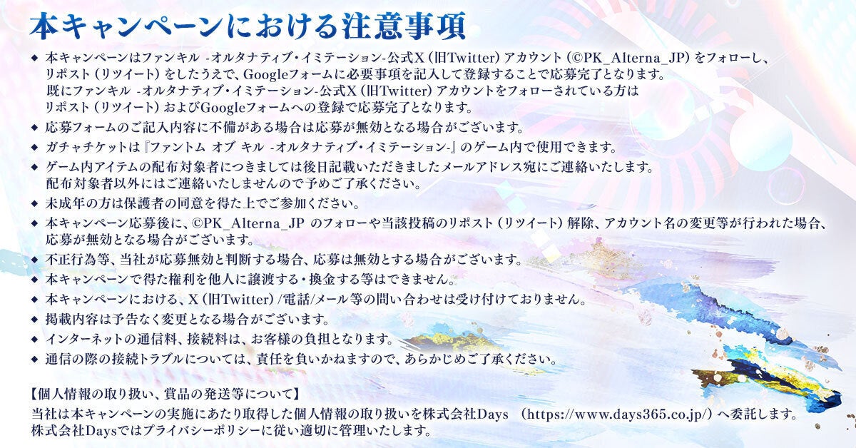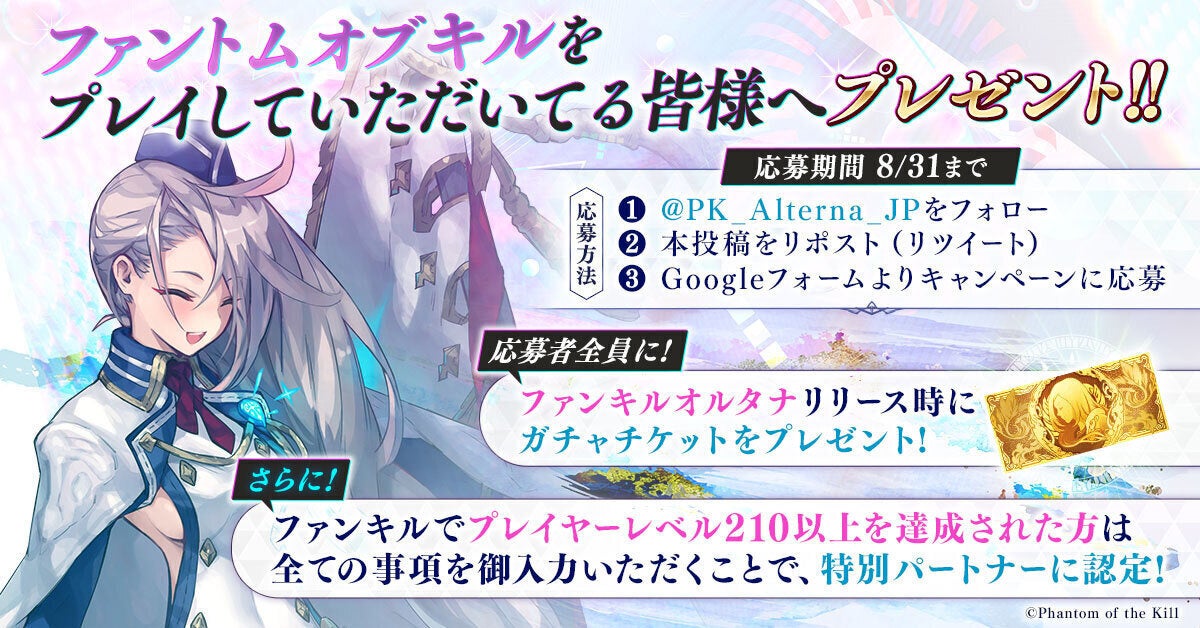併せて、キャンペーン応募者全員にガチャチケットの配布、及び、『ファントム オブ キル(ファンキル)』特別パートナー認定キャンペーンを開催することを発表した。