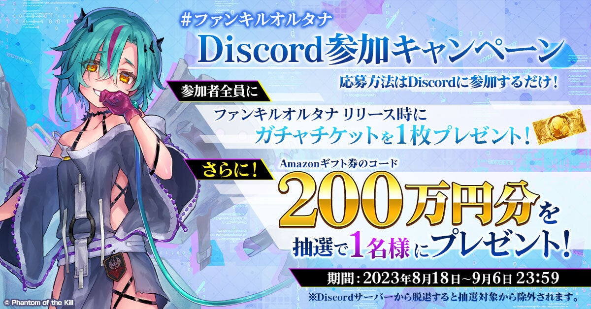 gumi<3903>は、『ファントム オブ キル(ファンキル)』(以下、『ファンキル』)のIPを活用した、新作ブロックチェーンゲーム『ファントム オブ キル -オルタナティブ・イミテーション-』にて、SNSの合計登録者数が2万を突破した記念として、抽選で1名様に200万円分のAmazonギフト券が当たる公式Discord参加キャンペーンを実施する。