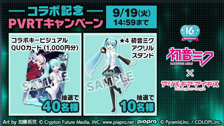 『初音ミク』コラボを記念して、抽選で豪華グッズが当たるTwitterキャンペーンを実施する。アリスギア公式Twitterをフォローしたうえで、対象のツイートをリツイートで応募完了となる。