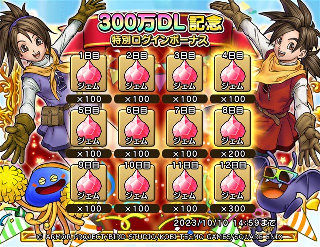 300万ダウンロードを記念して、特別ログインボーナスを開催する。開催期間中に、合計12日間ログインすると最大1500ジェムがもらえる!