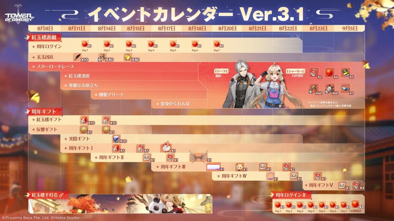 「紅玉楼遊戯」に参加することで専用貨幣を集め、プレミアムスキン「ジーク」や「シャーリー」、期間限定ガチャの引き換えアイテム「レッドコア」などと交換することが可能です。また、「周年ログインギフト」として、「レッドコア」をはじめとする豪華なアイテムが手に入るログインイベントも開催中ですので、この機会にゲーム内での盛り上がりをお楽しみください。