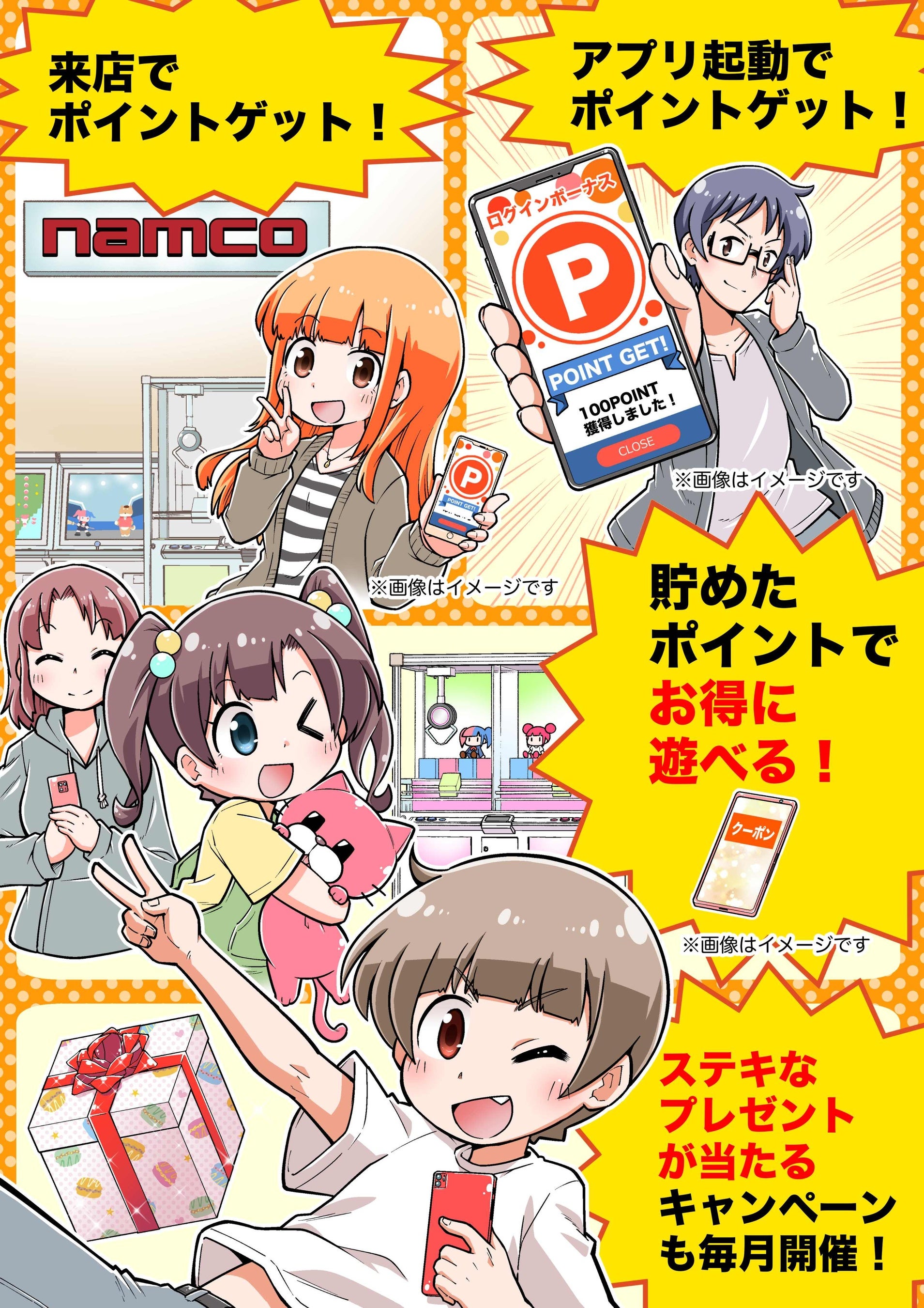 アプリを起動したり、ナムコへ遊びに行ったりするだけでポイントが貯まる、完全無料のポイントアプリです。貯めたポイントを使ってゲームを無料で楽しむことや、毎月実施している、賞品やギフト券などが当たるプレゼントキャンペーンに応募することができます!