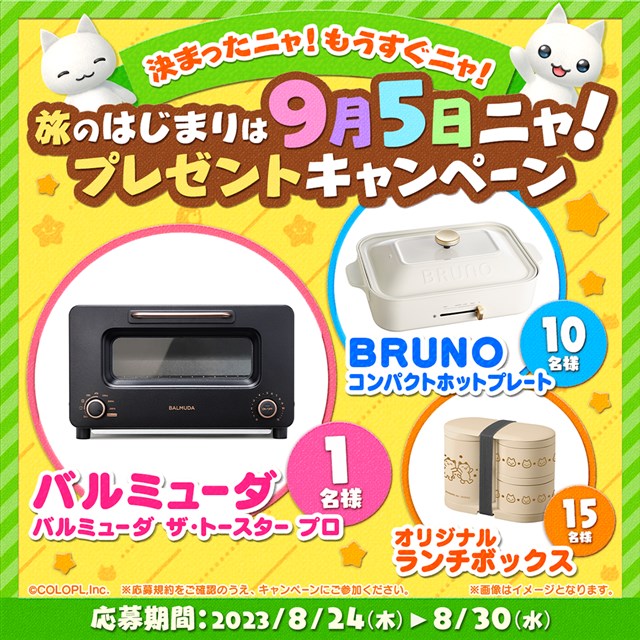 公式X (Twitter)、公式Instagram では、サービス開始日決定を記念して「旅のはじまりは9月5日ニャ!プレゼントキャンペーン」と題し、にゃんこたちがゲーム内で行う “りょうり” にちなみ、豪華キッチン家電やオリジナルグッズが当たるキャンペーンを開催している。